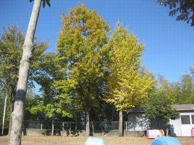 |  久しぶりに青空の美しい朝です。わが家の食堂から見えるイチョウの木が真黄色に色づいています。 |