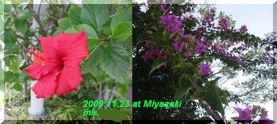 |   宮崎駅から徒歩5分でホテルです、その手前にこんな花が咲いていました。まるでハワイみたい~~ハイビスカスとブーゲンビリアです。 |