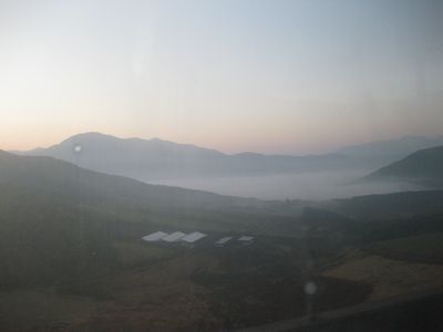 |  今日は用事があって、高速バスで福岡へ。由布院盆地に朝霧がたちこめて幻想的な風景になっています。 |