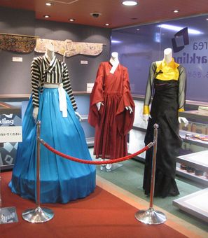 |   伝統的なチマチョゴリの雰囲気を残しながら、袖の扱い、またウエストの折り返しなど、斬新なデザインだと思います。それに、色の取り合わせが素敵です。 |