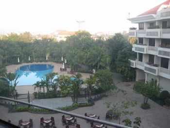 タイ・カンボジア旅行その5:2009年12月9日:シェムリアップ・バンテアイ・スレイ他今日の観光出発は8時、時間がゆっくりと流れます。ホテルを探検です。3階の窓から中庭をのぞくと、プールがありました。