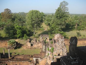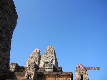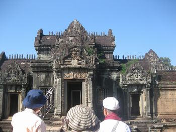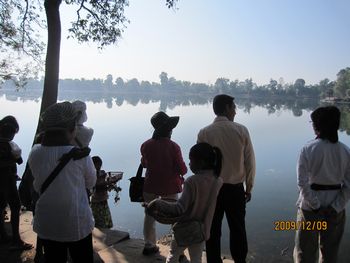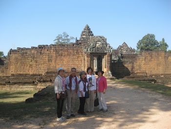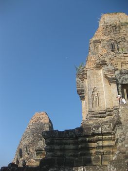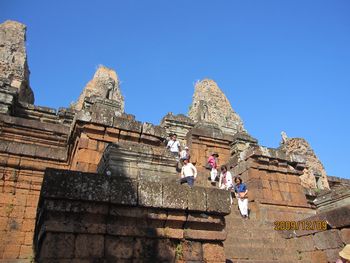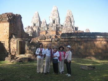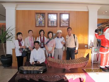 この中庭と続くレストランで朝食を頂くことが出来ます。ホテルの建物の周りには池があり、睡蓮が美しく咲いています。「ロータス」カンボジアでは大事にされている花です。 ホテルの玄関には、トナカイさんが、クリスマスのプレゼントを積んだソリを引っ張ってきました。でも、ちょっとおかしい?これはトナカイさんですか?それともシカですか? 朝、8時、ホテルのロビーでの楽器演奏を聴いていたらガイドのBUNYIさんが迎えにきました。さあ、今日も元気に観光に出かけましょう。記念写真を写しました。右端がBUNYIさんです。サンタクロースも見ていますね。 先ず最初は、スラ・スロンへ行きます。新しい道路が真っ直ぐに伸びています。車には、カンボジアの国旗が下がっていました。 スラ・スロン(聖なる池)ジャヤヴァルマン7世が造った王の沐浴場。東西700m、南北350mあり世界一大きいお風呂かもしれない。池の周囲は建物で囲まれていたがポルポトによって破壊された。 プレ・ループです。死者を荼毘に付した石槽があることで有名です。5基の中央祠堂はレンガでできています。レンガを使った巨大寺院としては最後のものです。東塔門を入っていきます。塔門の左右には3基ずつの祠堂が建っています。どんどん上に登っていきます。 プレ・ループとは体を裏返すという意味で961年にラジェンドラ・ヴァルマル2世が造ったヒンズー寺院です、3層のラテライトの基壇の上に砂岩の5つの祠堂が並ぶピラミッド型の構造になっている。 王の火葬場です、右の方には遺骨を洗う流しがありました。遺骨はガンジスの水の代わりにヤシのミルクで洗ってから骨壷に納める、カンボジアでは今もこの習慣が続いている。 階段を登って上からの眺めです。崩れかかった建物が見えます。 階段は下るにはやはり狭くて、急勾配で危険です、ガイドさんは心配そうに側を歩いてくれています。 塔の一つを見上げてみました。青空が見えていました。石が四角に積み上げられているのが分かります。