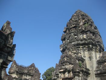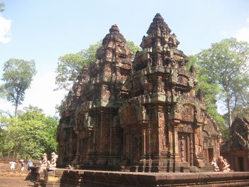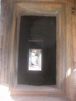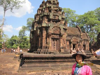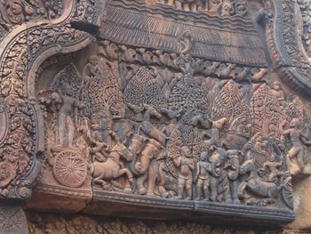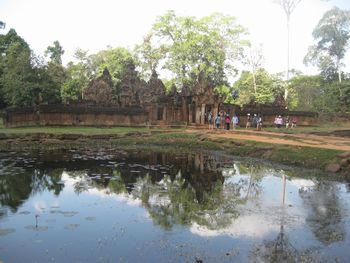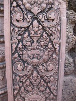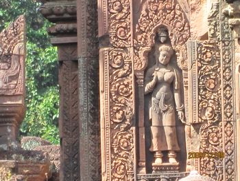 規模こそ小さいが、精巧で深くほられた美しい彫刻が全面に施されている。手前の仏像は、新しく復元されたものです。 南北の祠堂には「東洋のモナリザ」と評されるデヴァターの像が柔らかな曲線で彫られ、美しい姿を見せている。 。