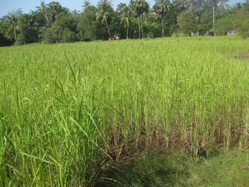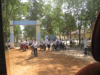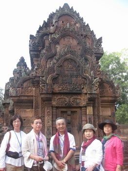 この寺院はポルポト時代に刑務所となっていたとか、窓は塗り篭められて、狭い廊下の部屋に大勢が閉じ込めれ監視され、稲作りに駆り出されたそうです。遺跡を出ると、周囲は稲作が盛んに行われています。稲が見たくて、近づいても良いですか?と稲を見に行った。稲は長粒米、まもなく稲刈りをするそうです。 車にのり、また移動です。道端の食堂です。台所の無い家が多いので、こうして食事をする人が多いそうです。 右の水色の机に並べて売っているのはフランスパンです。カンボジアは1953年11月に シアヌーク国王の時代にフランスより完全独立を達成しました。その影響でしょうか、パンはフランスパンが好まれる。子供が何本もフランスパンを抱えているのをよく見ました。 八百屋さんです。魚屋さんもあります。野菜は、瑞々しくて、いろんな種類があるように思います。そして、ハーブのようなものも色々並べられています。 ここは学校です、午前の授業が終わって、子供たちが帰宅しています。二部式授業なので、午後はまた違う子供たちがやってきます。カンボジアにはまだ義務教育の制度が無いそうです これは、アンコール遺跡群が 1992年、文化遺産として世界遺産に登録された印です。 バンテアイ・スレイに行きました。バンテアイは砦、スレイは女で、「女の砦」を意味する。967年アンコール王朝摂政役の王師ヤジュニャヴァラーハの菩提寺として建設されたと言われている。シヴァ神とヴィシュヌ神に捧げられた、周囲400mのヒンドゥー教の小寺院大部分が赤い砂岩により建造されている。