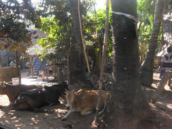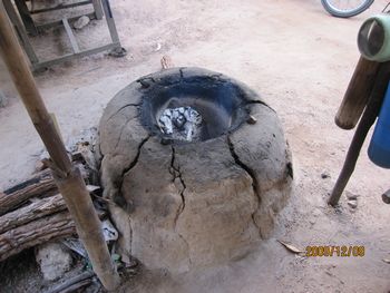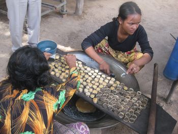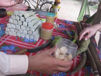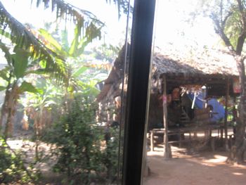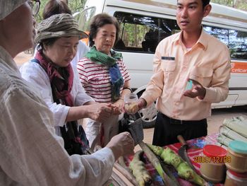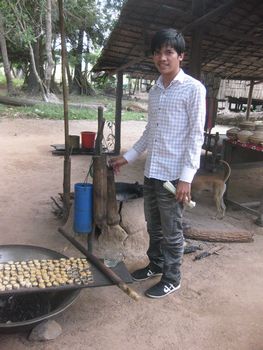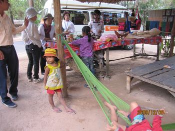 この竈で大鍋に入れたココナッツジュースを沸々と煮ていきます。煮ること3時間、ココナッツシュガーが出来上がります。透明なジュースの水分が飛んで底に砂糖が残ります。そうなると、火から下ろして、固まらないうちに、お団子にまるめて、椰子の葉で作ったケースに入れて冷まします。作業板を載せているのが大鍋、真ん中に白っぽくあるのが、煮詰まって出来た砂糖です。 ガイドさんが、試食をどうぞ、と配ってくれました。素朴な甘さの砂糖菓子、おいしかったです。 車の中から見て、気になったのが、左に積み上げてある物でした。その中味は、試食しているココナッツシュガー、15個ほどを椰子の葉で、包んでいます。3本US1ドルでした。 子どもも一人前に手伝いをしています。側にはハンモックが昼寝の子どもを乗せて、揺れていました。ハンモックは、高床式の家の土間によく揺れています。 こちらがバスの運転手さん、とても安全運転で、快適に観光をすることが出来ました。 砂糖工場(ガイドさんがこう言いました。どこに工場があるの?と皆で探しましたよ・・・・笑)の見学を終えて、車はシェムリアップの町へ戻ってきました。