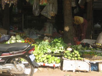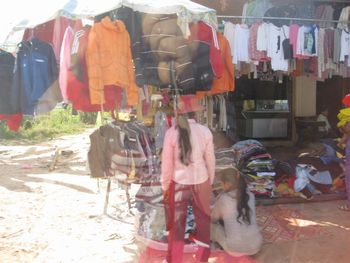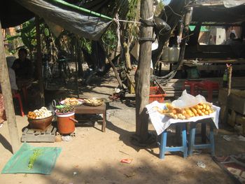 門の素晴らしいレリーフ、この緻密さ、すごい!の一言です。左の写真の拡大です。美しい祠堂の壁にデヴァター像(東洋のモナリザ像)があります。何を意味するこの形なんでしょう。 第二周壁の門を抜けると中央祠堂の前に出る。中央祠堂の左右には経蔵がある。 車に乗って、シュエリムアップの街へ戻ります。途中、気になる物があちこちの露天に並んでいました。あれは何を売っているのですか?