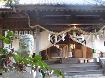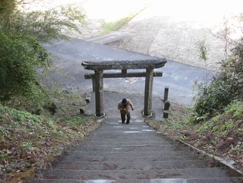 | 美しく掃き清められた石段が気持ち良いです。鈴を鳴らして、家族の健康と、世の中の平和なことなど、祈りました。そうしている間にも、お参りの人が次々と来られます。 |  |