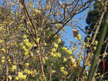 | 陽だまりでは、蝋梅が美しく咲いていました。この寒風の中、もうこんなに満開になっています。 |  |
