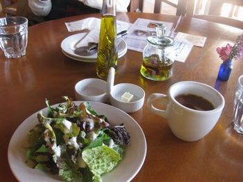 | 園内のハーブやお野菜を使ったサラダにスープ。パンにつけるハーブオイルやハーブバターは、私たちが作ったものと同じでした。 |  |