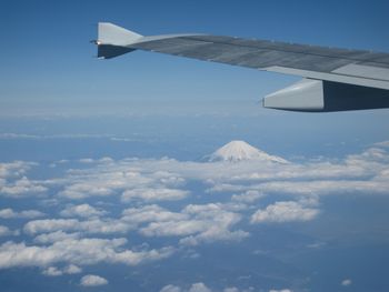 | 飛行機は定刻10:35に大分空港を離陸して快調に飛んでいます。富士山が見えますとのアナウンスに窓へ寄ってみました。真っ白の雪を頂いて美しく輝いて見えました。 |  |