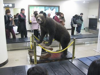 |  | トランクの回転台には、ひぐまが居ました。子熊でしょうか?それでもちょっとびっくりしました。 到着出口には既に弟夫婦が迎えに来てくれていました。 |