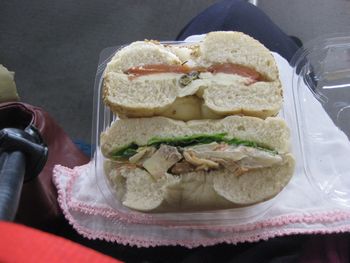 |  | 羽田空港で帯広行きに乗り継ぎです。時間が余りないので、簡単にランチです。 ベーグルのサンドイッチはサーモンにクリームチーズ、そして、ごぼうと鶏肉のサラダが入り、思った以上においしかったです。 |