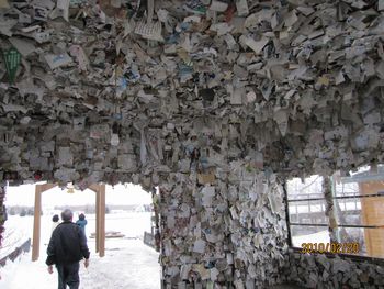 |  | 待合室の内外には利用者が残した名刺や使用済みの定期券などをがびっしりと貼られていました。私たちは大きなハガキ大の切符に、4人で寄せ書きをして母に送りました。 |