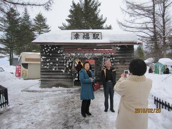 | すぐ近くには、愛国駅というのもあったそうで、二つを合わせて、歌にもなり多くの観光客が訪れるようになったのだそうだ。弟と一緒に政子さんに写真を写してもらう。 |  |
