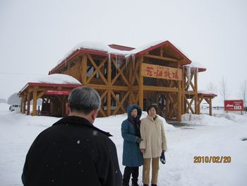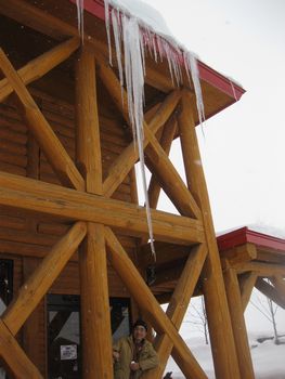 |  | ログハウスの売店の屋根から大きなつららが下がっています。下に居る夫と比べてください。見ただけでオオ寒い!です。 |