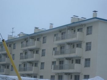 |  | アパートがたくさん建っています。屋上には煙突が並んでいて、イギリスのアパートみたいだと思いました。部屋のストーブの排気口でしょうか。しかし、最近の排気のシステムは変わって、煙突は無くなりつつあるみたいですけど。 |