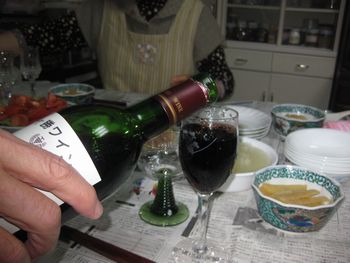 | おしゃべりしながら、すぐに夕食の用意が整いました。テーブルに新聞紙を敷いて、焼肉の準備です。 いつも弟が実家に持って来てくれている十勝ワインを開けてくれました。本場で飲むのでおいしさもひとしおです。 |  |