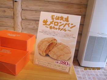 | 最近、出来た名物は、この生キャラメル入りのカスタードが入ったメロンパンだそうです。早速、サービスのコーヒーをもらって、食べました。甘くて、おいしかったです。 |  |