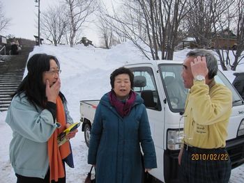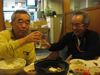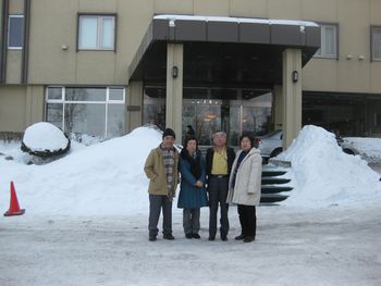 | 足寄から一路、帯広へ、和彦さんは車を走らせます。7時前に帰り着きました。今夜の夕食は鶏料理屋さんで、食べることにしました。湯豆腐、焼き鳥など、二日間雪道を運転してあちこち案内してくれたお2人に感謝しつつ、おいしく頂きました。 とうとう、北海道最後の日となりました。今日は会社を休んでくれた和彦さん、ありがとう。 |  |