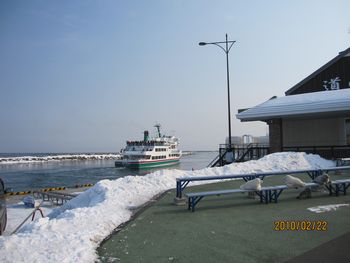 |  | すぐに「オーロラ2号」に乗り込むことが出来ました。室内はソファーの快適な椅子ですが、風に当たりながら流氷をみました。沖に行くに従って、氷が増えてきます。 |