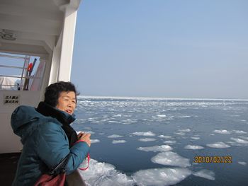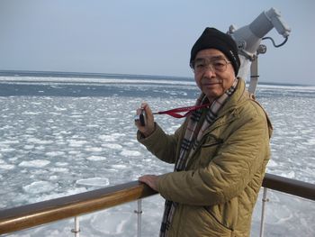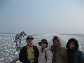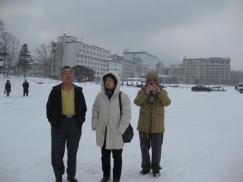 | ホテル前で、記念写真を写していただいて、早速出発です。 流氷を見る船に乗りますが、乗り場が変更になっていて、あやうく乗り遅れる所で、慌てました。 乗り場に着いた時には、先の船が出港したところでした。 |  |