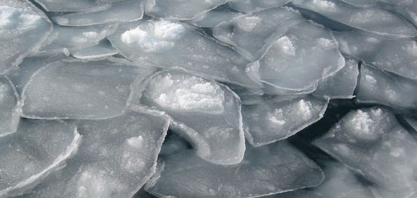| まだまだ薄い氷で、船の波が当たると折れていますが時々は盛り上がるように分厚い氷も浮いています。流氷を見ているなんて、信じられない気持ちで感動します。 |  |