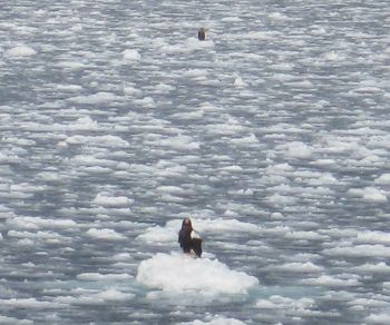 | 遠くに鷲が居ました。双眼鏡で見ましたが、帰路には、肉眼ではっきり確認できる近さで鷲を見ることが出来ました。胸を張って、氷の上に止まっている姿は、鳥の王者の風格です。 |  |