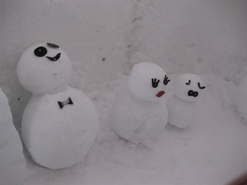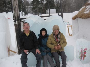 | 氷や雪を積み上げて、家が作ってありました。中にたくさん雪だるまが居ました。阿寒湖の氷は70センチほどの厚みがあるそうですが、年々薄くなっていると地元の青年の言葉でした。 |  |