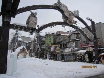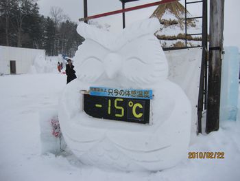 |  | スノーモービルなど、体験も出来ますが、寒さには勝てません。 阿寒湖温泉街のアイヌの方々のお土産やさんが並んでいる通りへきました。入り口には立派な木彫りの大鷲と、ふくろうが迎えてくれます。 |