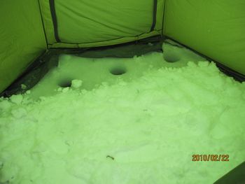 | 氷に穴があけてあります。そこへ釣り糸を垂れると公魚がひっかかるという仕組みです。風除けのテントですが、やっぱり寒いでしょうね。吊り上げた途端に、冷凍ワカサギになるようです。 |  |