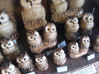 | アイヌの彫刻というと、昔は熊でしたが、今はふくろうが好まれているそうです。ふくろう彫りが忙しくて熊を作る人は今は居ないとのこと。フクロウは魔除けだったり、学問の神様だったり、人気者だそうです。 |  |