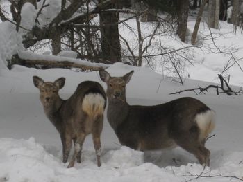 |  | 阿寒湖を後にして林の中の道をまた走ります。この辺りでは動物が見られるよ、と弟が言ったとたんに、鹿を見つけました。Uターンして見に行きましたら、まだ仲良く二匹が雪の中に居ました。カメラを向けても逃げることなく、とても可愛い、まだ角の無いエゾシカです。 |