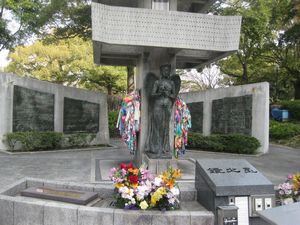 | 川の向こうからお参りはしたことがあるのですが、側に来てのお参りは初めてでした。ドームのすぐ側には、学徒動員で亡くなられた若い人たちの慰霊碑がありました。多くの犠牲の上にある今の平和を大切にしなくてはと強く思いました。 | ![]() |