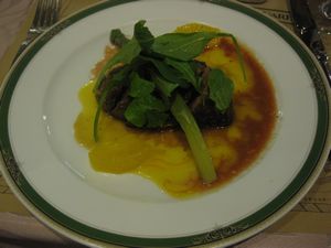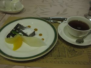 かぼちゃのポタージュ、鴨肉のメインディッシュ、サラダ、デザートはガトーショコラにフルーツ、どのお料理もとてもおいしかったです。 |