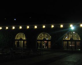 外はもう真っ暗になっていました。アイビースクエアの真ん中に立つと、飾り窓から漏れる光が美しかったです。 |