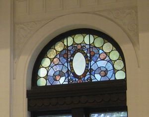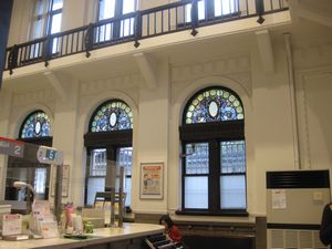 | 土蔵塀に挟まれた細い路地を抜けると、モダンな建物がありました。これは中国銀行倉敷本町出張所(旧第一合同銀行倉敷支店)です。1922年に竣工したルネサンス風建築で、国の登録有形文化財(建造物)に指定されています。 そっと入ってみました。半円形の窓のステンドグラスがとても美しかったです。 |