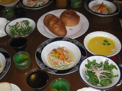 |  実習したお料理は、ニンジンスープ、鮭と野菜の南蛮漬け、クレソンのサラダ、パンは、私が昨日焼いたクルミパンを持って行きました。 デザートは、ペパーミントゼリーに、コーヒーゼリー、 教えて頂きながら焼いたパネトーネは、おやつに頂きます。 |  |
