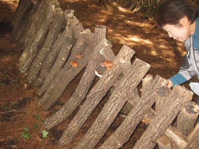 |  | たくさん、ご馳走を頂いて、食後の散歩に、お庭に出ました。丹精されている椎茸の収穫をさせて頂きました。 |