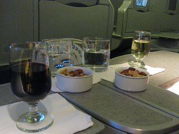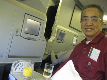 18時5分発のAAニューヨークラガーディア空港行きです。 ビジネスシートはとてもゆったりで席に着くとすぐにウエルカムドリンクが出てきました。 リクライニングシートや,リモコンをいろいろ試したりしているうちに、離陸です。 |