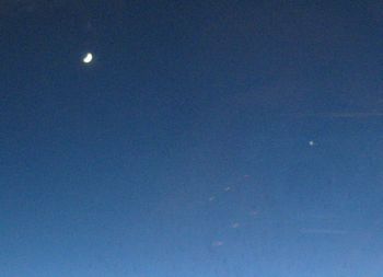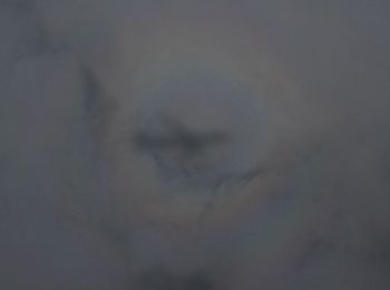 | シートを倒して寝ました。やはり手足が伸ばせるって気持ちよく眠れます。眼が覚めたら着陸1時間前で、皆さんは朝食中、私はとうとう、食べる時間はありませんでした。残念。 時々覗いた窓の外、月と金星が青い空にぽっかり浮かんでいました。また、右は、虹の輪のなかに飛行機の陰が幻想的です。 |