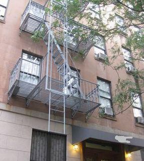 | 鉄の外階段がミュージカル「ウエストサイドストーリー」の世界だとうれしくなりました。ここの4階がこれからの住まいです。 2ベッドルーム、バストイレ、リビングキッチンの付いた家。快適です。オーナーさんから色々と家の使い方、この辺りでの暮らし方の注意を伺いました。 |