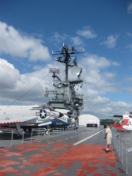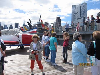 | 空母インテルピットがハドソン川に浮いています。甲板上にはたくさんの戦闘機が展示してあります。 | ![]() |