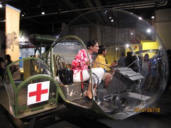 救護ヘリコプターの操縦室に座って、記念撮影をしてる親子。Gショックの体験が出来るブースや、飛行機の飛ぶ原理が分かる仕組みや、様々な施設があり、家族連れがたくさん訪れていました。 |