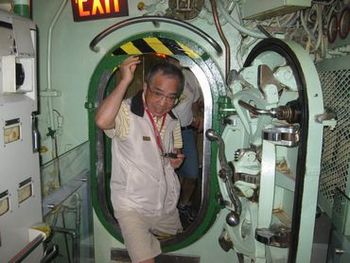 | すぐ側には、潜水艦やコンコルドも展示されていて、実際に中へ入ることが出来た。 右は潜水艦のハッチを潜り抜けている所です。 入艦前にはこの大きさの穴を通るテストがあり、通過できた人だけが、潜水艦の見学が出来ます。 |