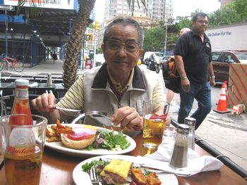 | 大きな空母の中を歩き廻って、すっかりお腹が減りました。12時もとっくに廻っています。歩いていたら、何だかおいしそうな匂いが・・・・道路に張り出した椅子席で、バーガーセット一人前を2人でおいしく頂きました。 | ![]() |