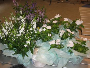 |  | 私は、昨夜の搬入が手伝えなかったので、今朝は早く出てきました。昨夜のうちに準備されていたお花のラッピングをしました。 |