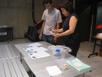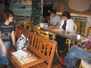 | 会場の準備もできたので、ピアニストの深田さん、音響・照明のTAKEFIVEの皆さんと打ち合わせです。 |  |