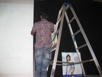 |  | スクリーンの両側にはるポスターは、TAKEFIVEの加藤さんが気持ち良く、手伝ってくださいます。 |