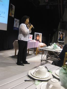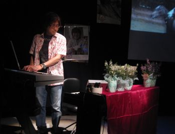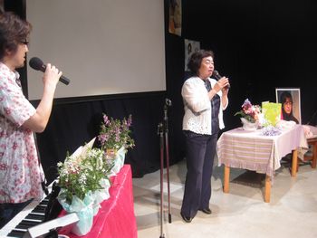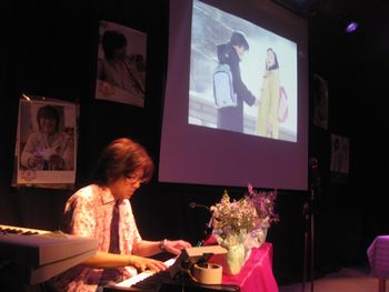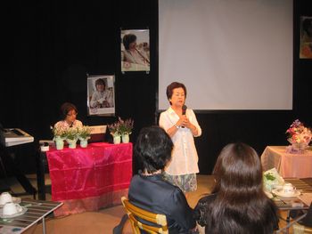 | おいしいケーキに紅茶を楽しまれているところへ、深田ミニョンさんのライブ第二部が始まりました。 ヨンジュンさんのたくさんのドラマの中から私たちの大好きなメロディが奏でられます。先ずはエレクトーンを駆使して「タムドクのテーマ」です。 |  |