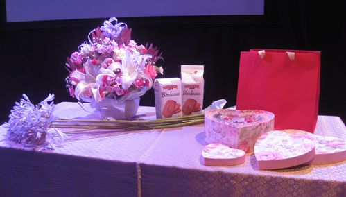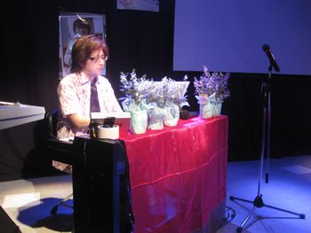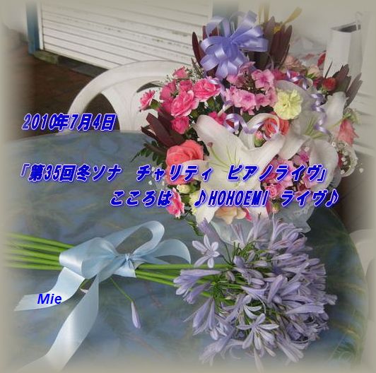| ステージのテーブルには、パク・ヨンハさんへの追悼の気持ちを込めて、 Miss Paddingtonさんからは真っ白のユリと優しいピンクのお花でまとめた花篭と Mieの庭に咲いていたアガパンサスを置きました。 他には 先日、ヨンジュンさんにお渡ししたプレゼントのレプリカと、MieのNYみやげのクッキーです。 | |